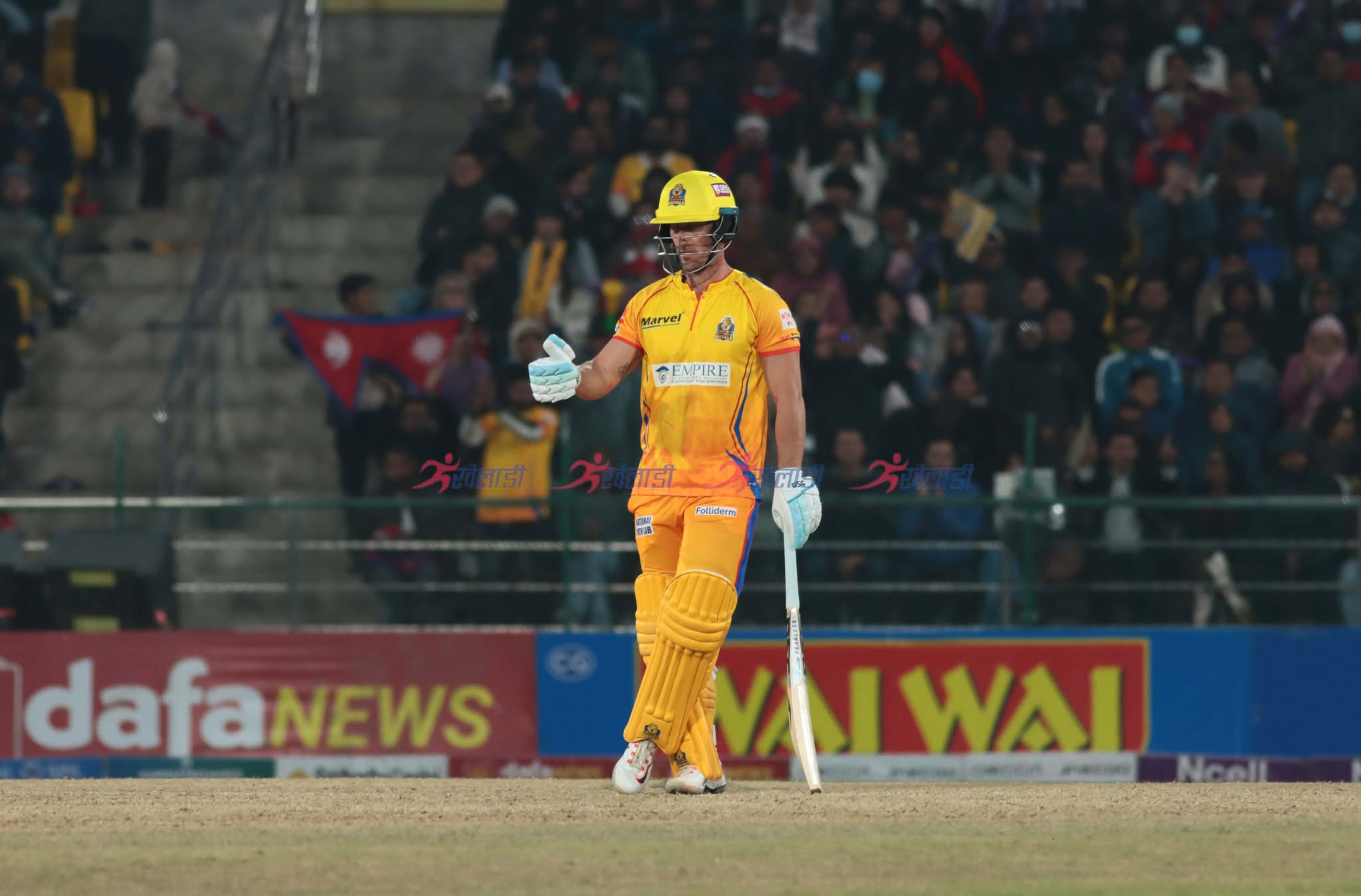 देवले चौंथो विकेटका लागि आकाश त्रिवाठीसँग ४९ रनको साझेदारी गरे । आकाश १६ रन बनाएर आउट भए ।