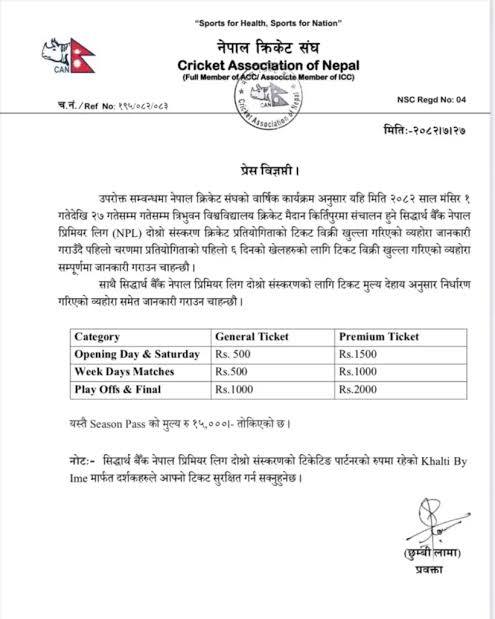 काठमाडौं । नेपाल क्रिकेट संघ (क्यान)ले नेपाल प्रिमियर लिग (एनपिएल) को टिकट मुल्य एक्कासी बढाएको छ ।