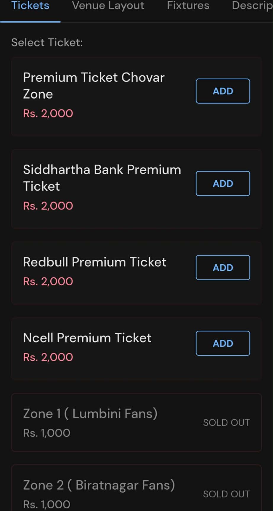 टिकट विक्रीको जिम्मेवारी पाएको खल्तीले पनि यही निर्धारण सार्वजनिक गरेको छ । यसअघि खोलेको केही घण्टामै टिकट सोल्ड आउट हुने गरेपनि १२ घण्टासम्म बढाएको जोनको टिकट अझै पूर्ण विक्री भएको छैन ।