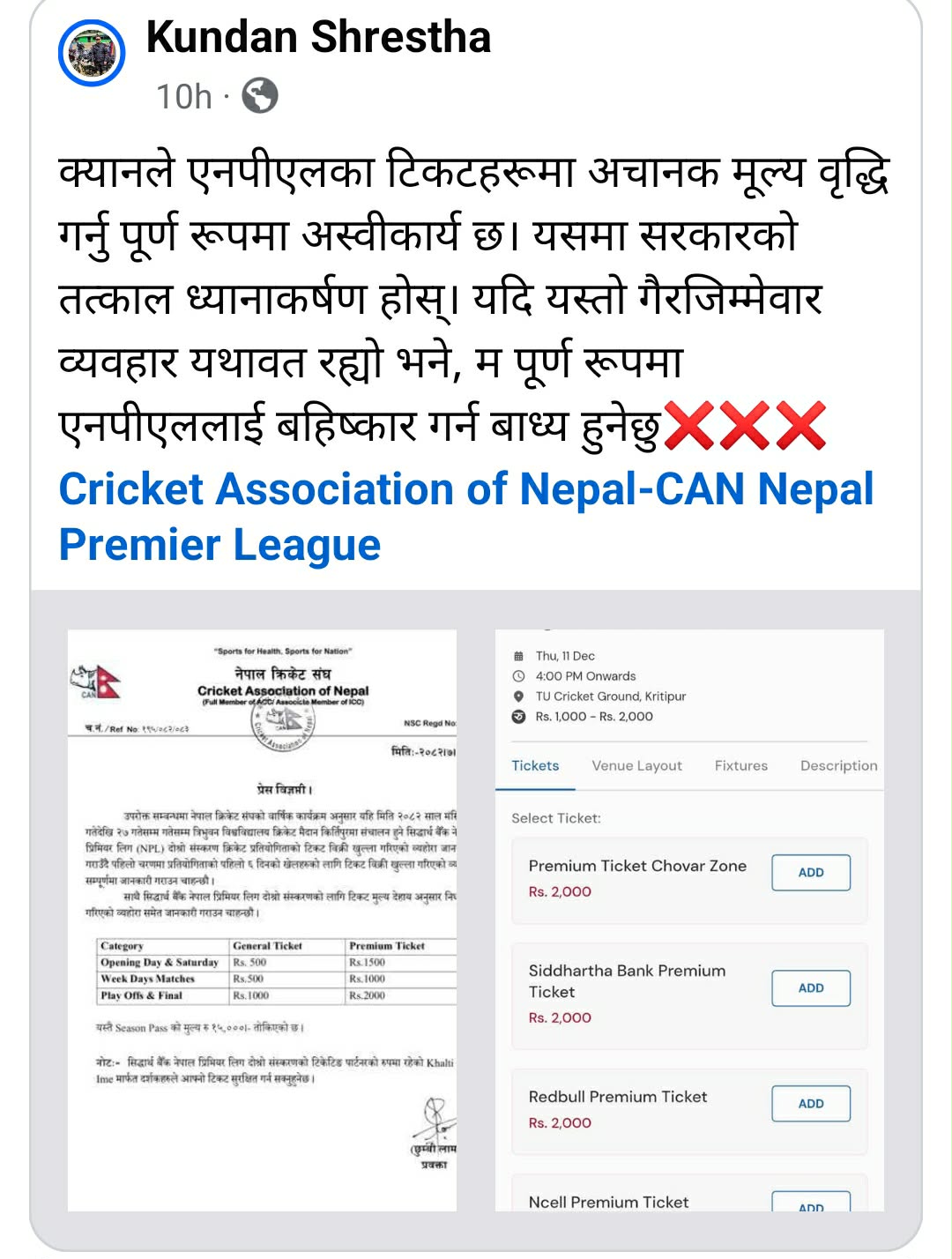 सामाजिक संजालमा कुन्दन श्रेष्ठ लेख्छन्, ‘क्यानले एनपिएलका टिकटहरु अचान मुल्य बृद्धि गर्नु पूर्णरुपमा अस्विकार्य छ । यसमा सरकारको तत्कान ध्यानाकर्षण होस्,’ उनले लेखेका छन्, ‘यदि यस्तो गैरजिम्मेवार व्यवहार यथावत रह्यो भने पूर्ण रुपमा एनपिएललाई बहिस्कार गर्न बाध्य हुनेछु ।’