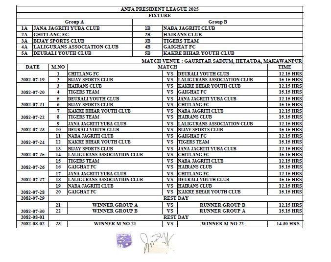 एन्फा प्रेसिडेन्ट लिगको खेलतालिका सार्वजनिक, उद्घाटन खेलमा चित्लाङ र देउराली भिड्ने