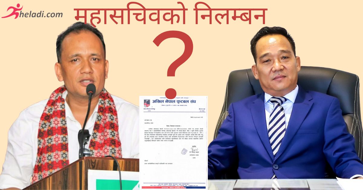 काठमाडौं । अखिल नेपाल फुटबल संघ (एन्फा)का वरिष्ठ उपाध्यक्ष वीरबहादुर खड्काले कार्यवाहक अध्यक्षको हैसियतमा आइतबार महासचिव किरण राईलाई निलम्बन गरेका छन् ।