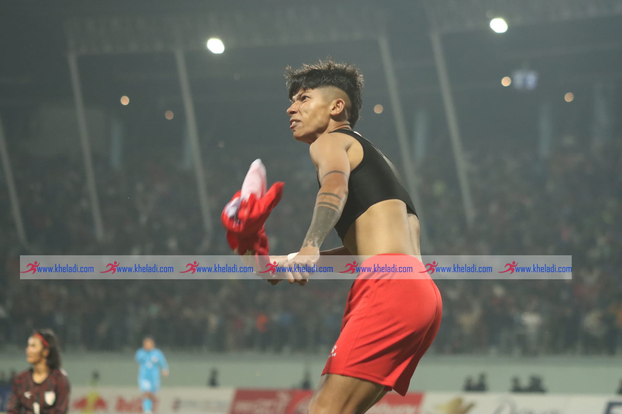 साफ च्याम्पियनसिप २०२४ को सेमिफाइनलमा भारतविरुद्ध गोल गरेपछि सावित्रा भण्डारी, फाइल तस्विरः सरोज सापकोटा/खेलाडी ।