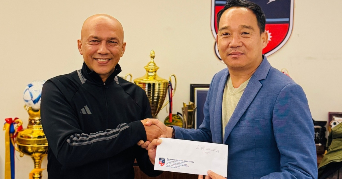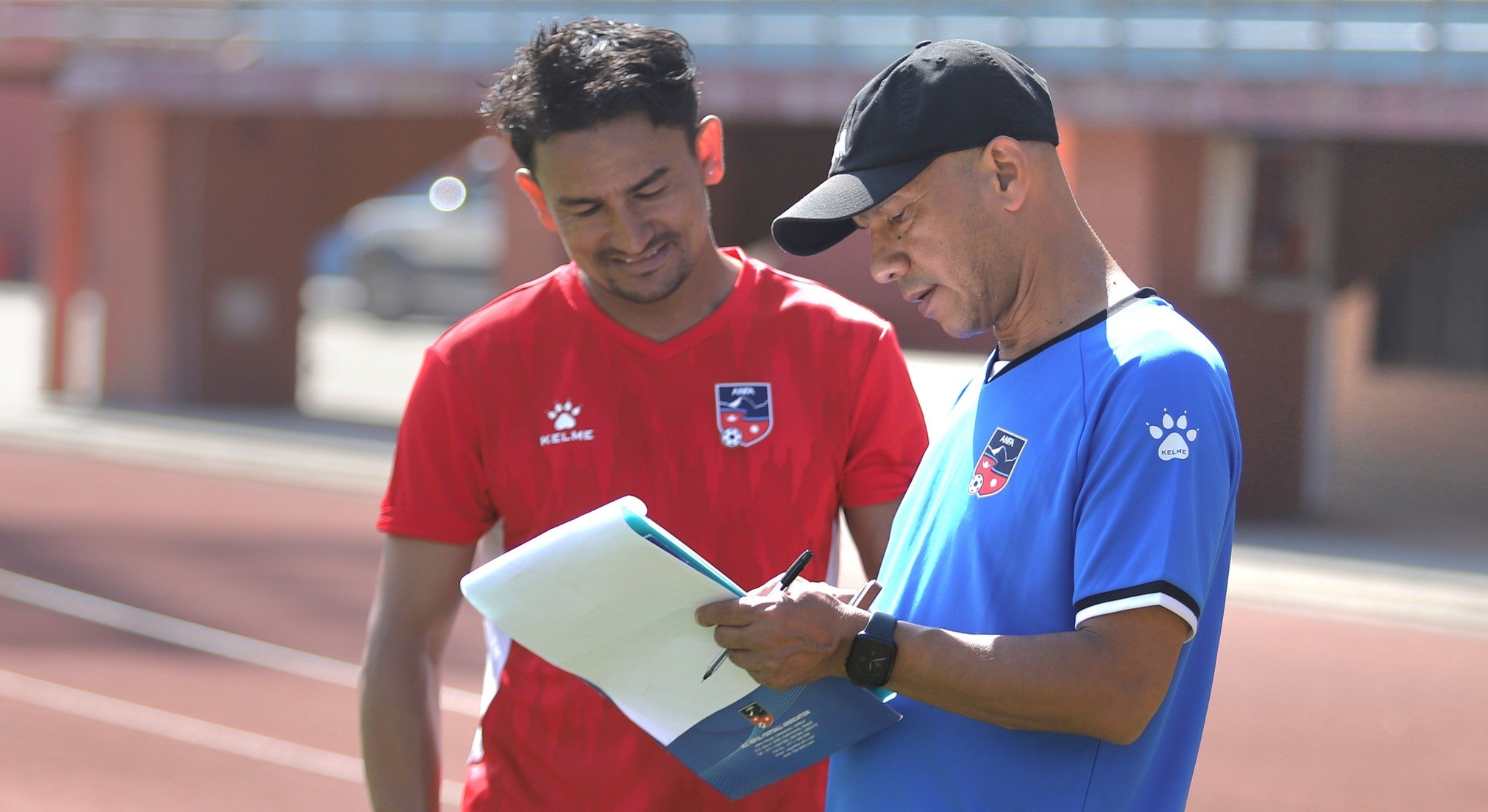 नेपाली राष्ट्रिय फुटबल टोलीका मुख्य प्रशिक्षक हरि खड्का र सहायक प्रशिक्षक चेतनकुमार घिमिरे, तस्विरः एन्फा ।