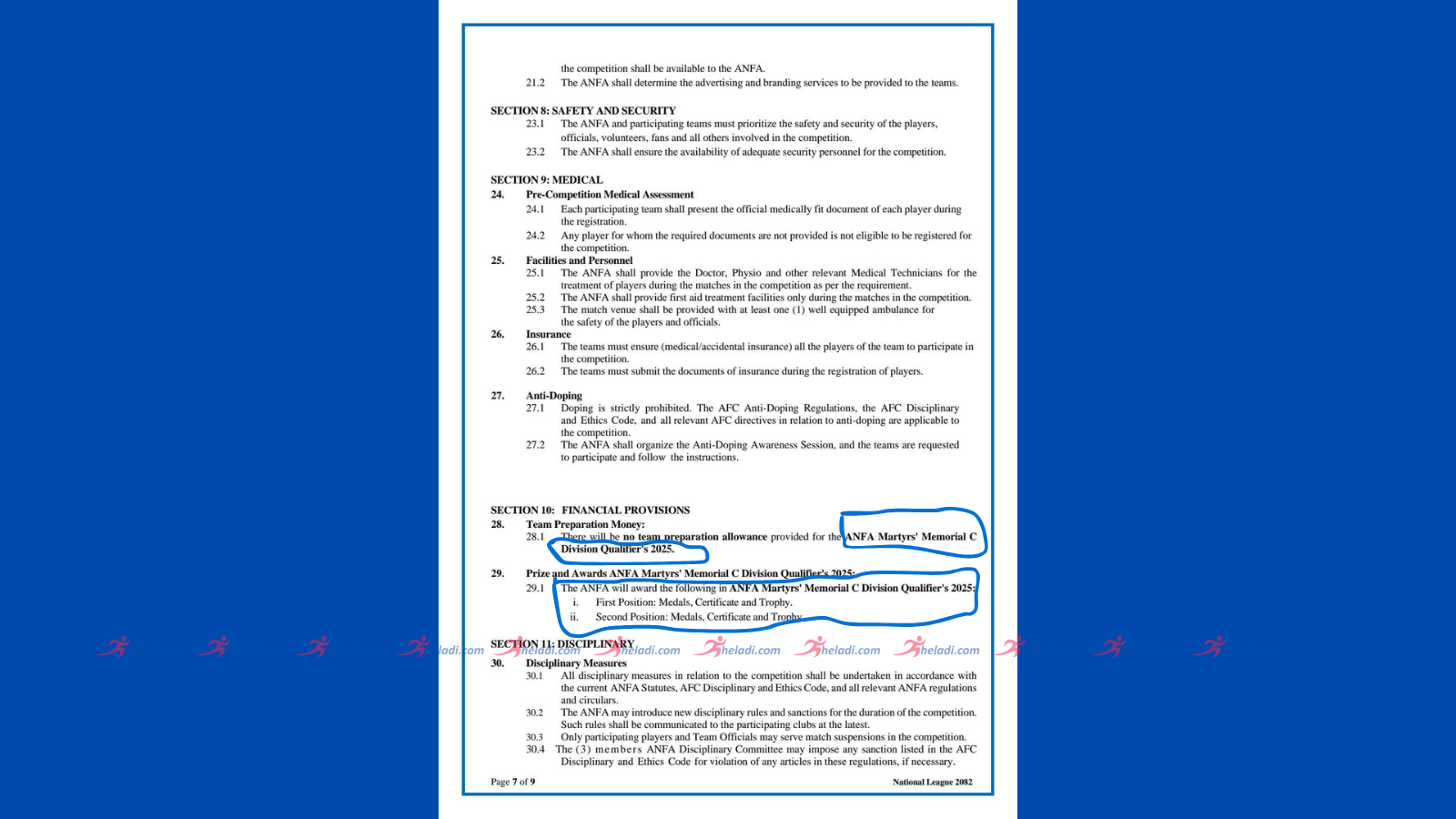 एन्फाले राष्ट्रिय लिग २०८२ को नियमावली भन्दै पठाएको ९ पेज लामो नियमावलीको सातौं पेजमा त्यस्तो लापरवाहीपूर्ण हरफहरु छन् । जहाँ सेक्सन १९ अन्तर्गत आर्थिक प्रावधानका दुई बूँदा छन् । बूँदा नम्बर २८ मा लेखिएको छ, ‘एन्फा सहिद स्मारक सी डिभिजन लिग छनोट २०२५ मा टिमहरुलाई तयारी खर्च उपलब्ध गराइने छैन ।’