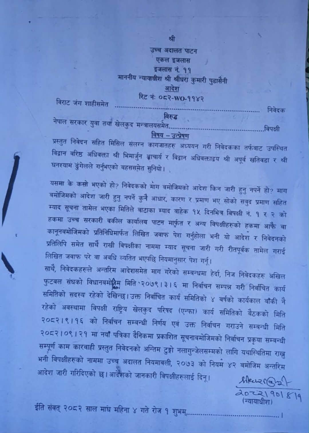 आदेशमा भनिएको छ, ‘निवेदकहरुले अन्तरिम आदेशसमेत माग गरेको सम्बन्धमा हेर्दा, निज निवेदकहरु अखिल फुटवल संघको विधानबमोजिम २०७९ असार ६ गते निर्वाचन सम्पन्न गरी निर्वाचित कार्य समितिको सदस्य रहेको देखिन्छ । उक्त निर्वाचित कार्य समितिको ४ वर्षको कार्यकाल बाँकी नै रहेको अवस्थामा विपक्षी एन्फा कार्य समितिको बैठकको मिति २०८२ पुस १६ गते निर्वाचन सम्बन्धी निर्णय एवं उक्त निर्वाचन गराउने सम्बन्धी सम्पूर्ण काम कारवाही प्रस्तुत निवेदनको अन्तिम टुङ्गो नलागुन्जेलसम्मको लागि यथास्थितिमा राख्नु भनी विपक्षीहरुको नाममा उच्च अदालत नियमावली, २०७३ को नियम ४२ बमोजिम अन्तरिम आदेश जारी गरिदिएको छ ।’
