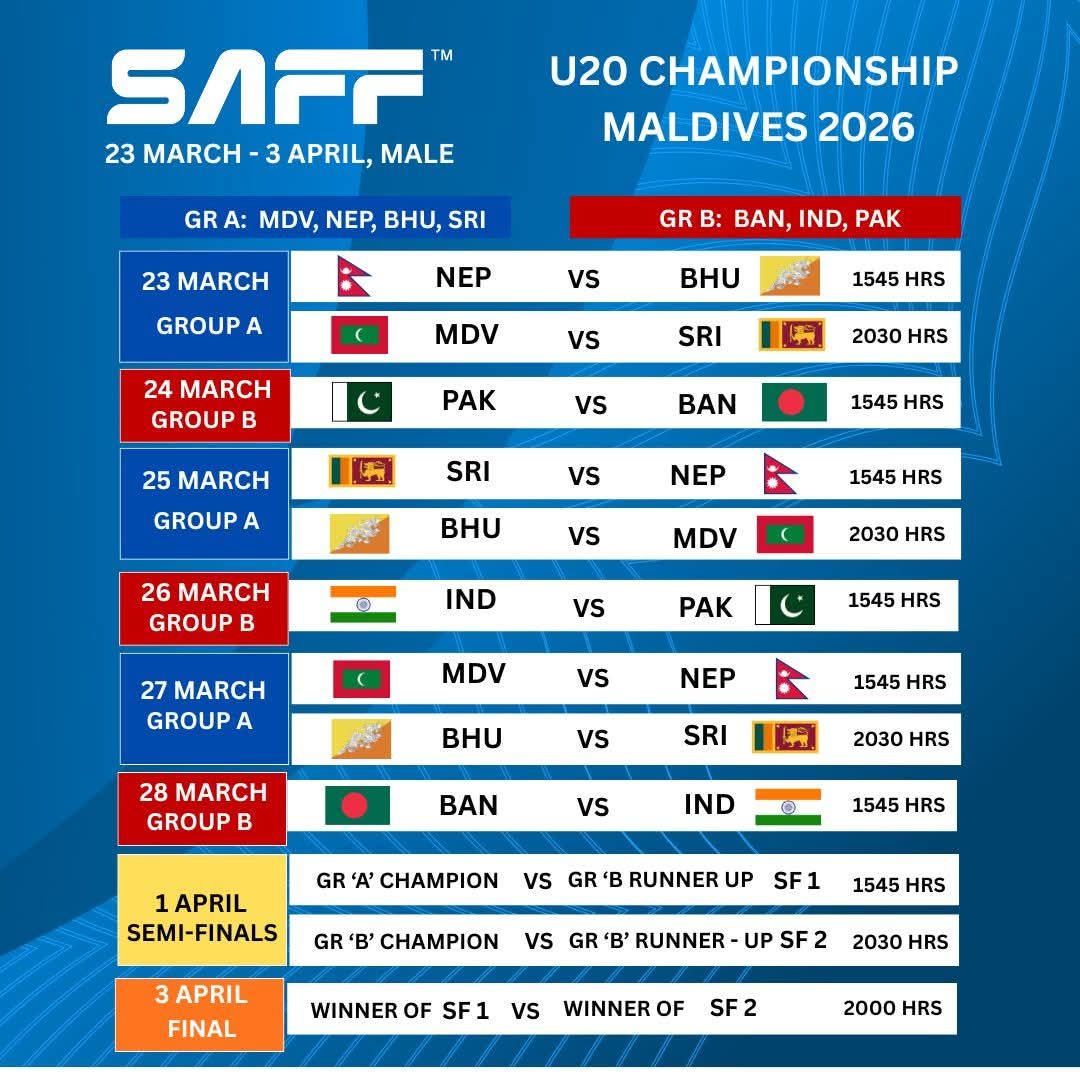 काठामडौं । माल्दिभ्समा मार्च २३ देखि अप्रिल ४ सम्म हुने साफ यु-२० च्याम्पियनसिपको खेलतालिका सार्वजनिक भएको छ ।