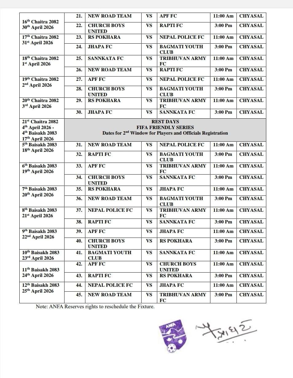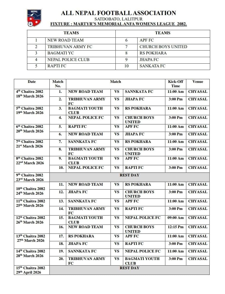 बिहीबार अखिल नेपाल फुटबल संघ (एन्फा)ले खेलतालिका सार्वजनिक गरेको हो ।
