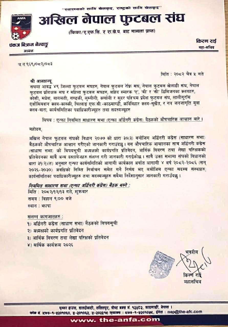 तर एन्फाले उम्मेदवारी दर्तासम्मको सबै प्रक्रिया पूरा गरेर गत महिना निर्वाचनको कार्यक्रा रोकेको बताएको थियो । राखेपले विगतमा पटकपटक दिएका निर्देशनको अटेर गरेको भन्दै एन्फालाई बिहीबार कडा पत्र लेखेर तत्काल निर्वाचन तथा साधारणसभा स्थगित गरेर तीन दिनभित्र जानकारी गराउन निर्देशन दिएको थियो । तर एन्फाले भने बिहीबारै आफ्ना सबै सदस्यहरुको नाममा सूचना जारी गर्दै चैत १३ गतेका लागि तय गरिएको साधारणसभाको औपचारिक आह्वान गरेको छ ।