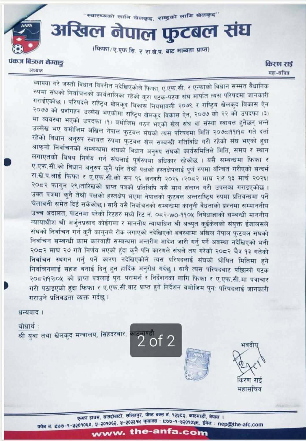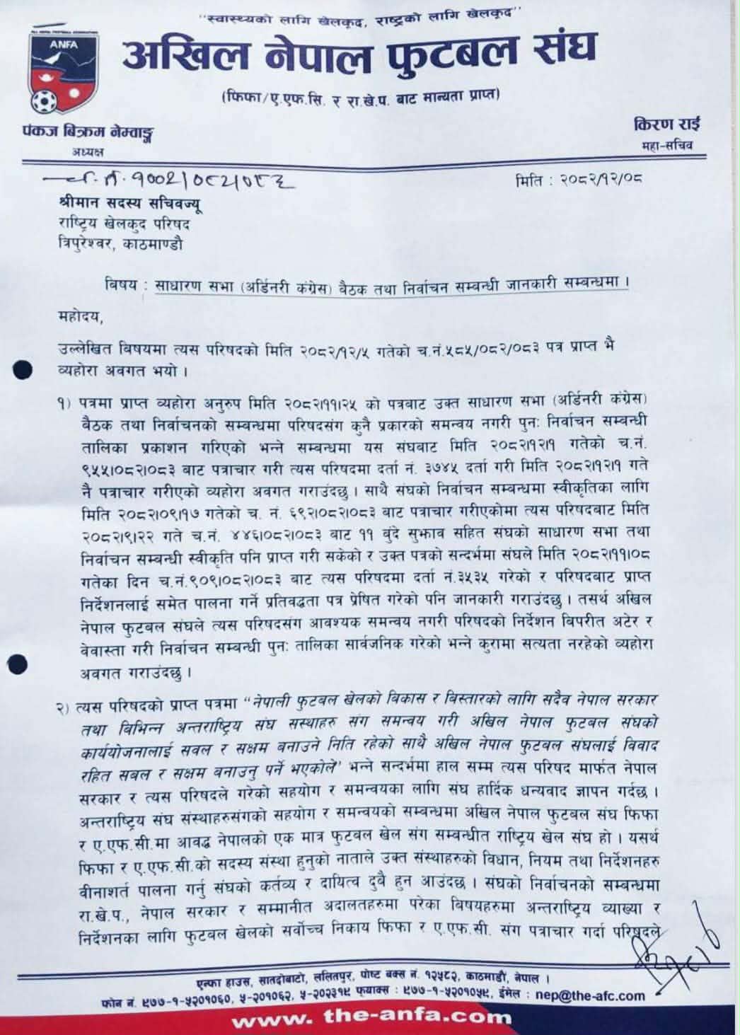 राखेप सदस्य सचिव रामचरित्र मेहतालाई सम्बोधन गरिएको, किरण राईद्धारा हस्ताक्षरित पत्रमा निर्वाचन राखेपले भनेजस्तो विधानविपरित नभएको उल्लेख गरिएको छ । त्यस्तै पत्रमा निर्वाचन तोकिएकै समयमा नभए फिफा र एएफसीले नेपाललाई प्रतिबन्ध गर्न सक्ने कुरा उल्लेख गरिएको छ ।