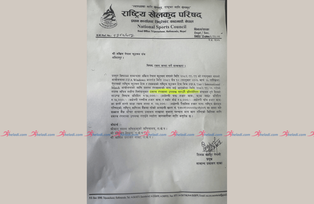 तर त्यसको एक घण्टा पनि नबित्दै राखेपले अर्को एउटा पत्र सार्वजनिक गर्यो । यही चैत ३ गते एन्फाका नाममा काटिएको पत्रमा प्रष्टसँग ‘साउन्ड सिस्टम, फ्लड लाइट र स्कोरबोर्डलगायतका सामाग्री प्रयोगका लागि ४५ हजार रुपैयाँ राष्ट्रिय बाँणिज्य बैंकमा रहेको राखेपको खातामा जम्मा गरेर सक्कल भौचर बुझाएपछि रंगशाला प्रयोग गर्नु’ भनिएको छ ।