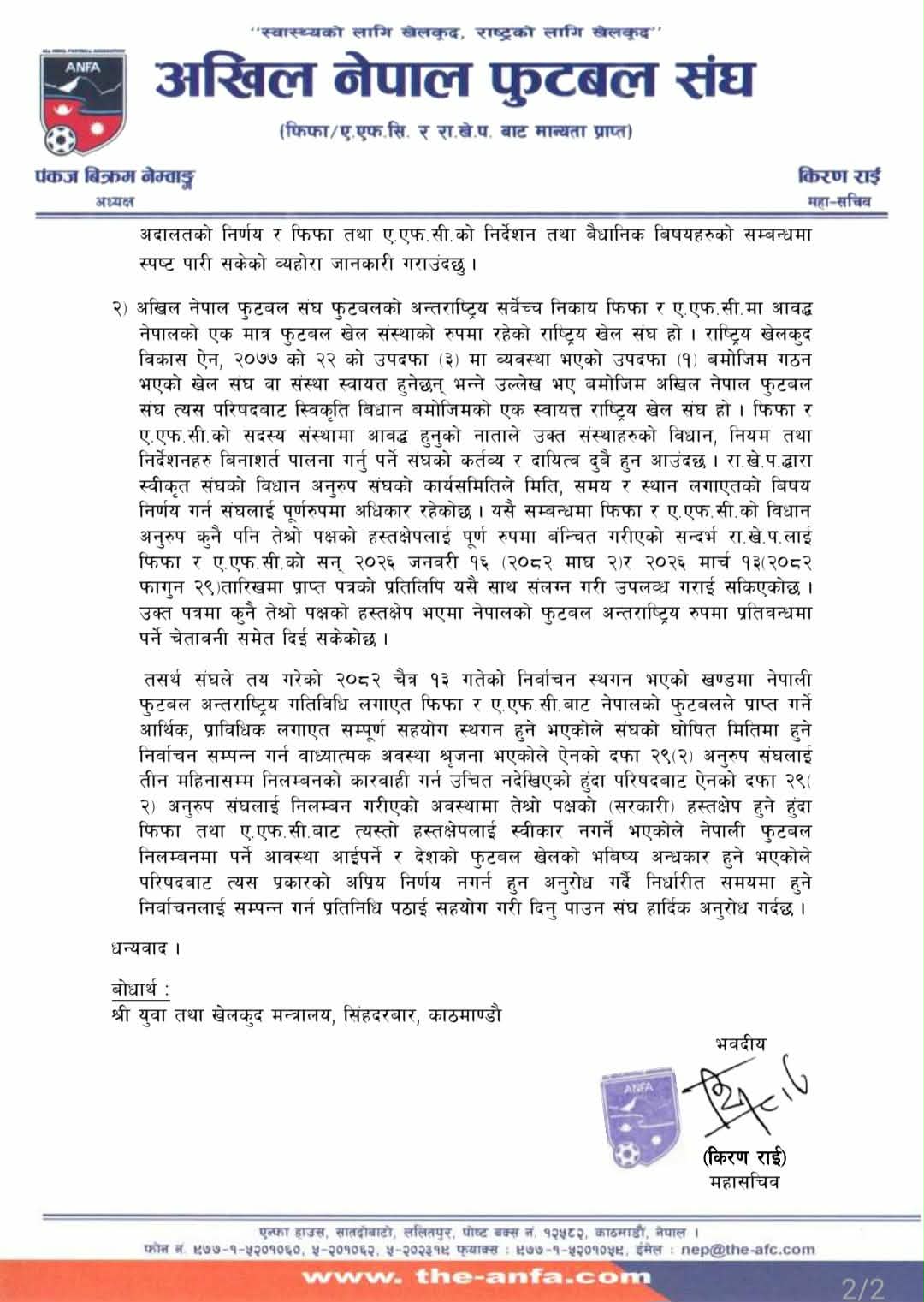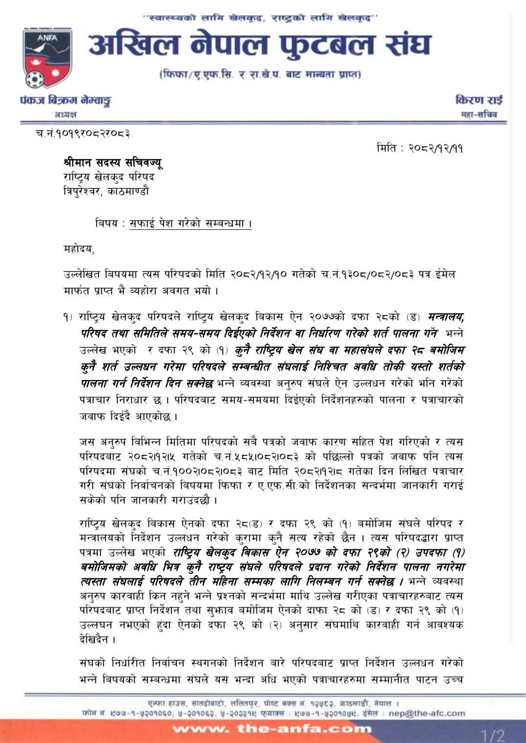 त्यस्तै राखेपको निर्णय नमानेको भन्ने एन्फामाथिको आरोप पूर्ण रुपमा निराधार भएको बताएको छ । यसैगरी चैत १३ मा निर्वाचन नगरे फिफा र एएफसीले निलम्बन गर्ने चेतावनी दिइसक्नुका साथै राखेपले लेखेका सबै पत्रको जवाफ दिएको लगायतको परिस्थितिमा एन्फामाथि कुनै पनि खालको कार्बाही अथवा निलम्बन गर्ने अनुरोध गरिएको छ । साथै एन्फाले चुनावमा प्रतिनिधि पठाई सहयोग गर्न आह्वान गरेको छ ।