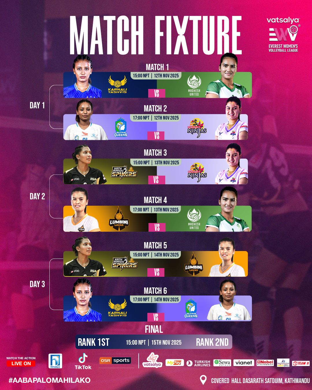 काठमाडौं । एभरेष्ट महिला भलिबल लिग (इडब्लुभिएल)को नयाँ खेलतालिका सार्वजनिक भएको छ ।